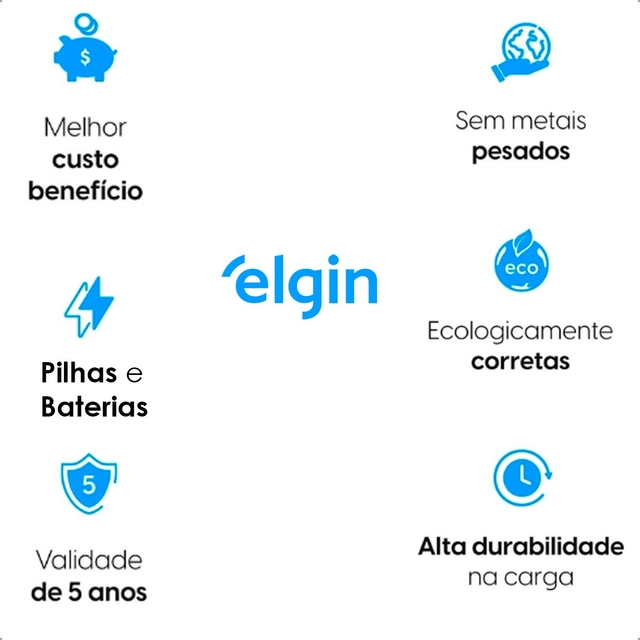 Qualidade Elgin com as baterias Elgin são testadas e aprovadas sob os mais rígidos padrões de qualidade, assegurando melhor desempenho aos dispositivos. Ecologicamente Corretas, essas Baterias Elgin não agridem o meio ambiente porque têm 0% de metais pesados em sua composição.