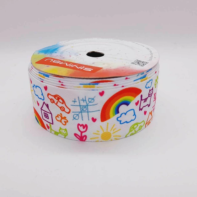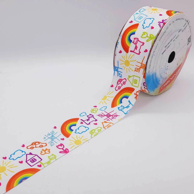 - Fita Jeans com Fundo Branco e Estampa Escolar de Arco-Iris/Nuvem/Sol
