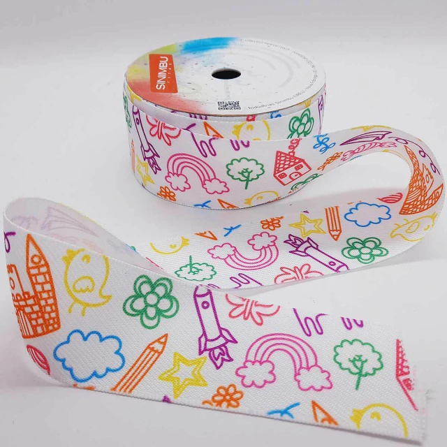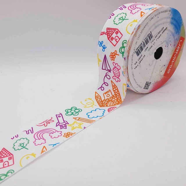 - Fita Jeans com Fundo Branco e Estampa Escolar de Castelo/Foguete/Nuvem/Lapis