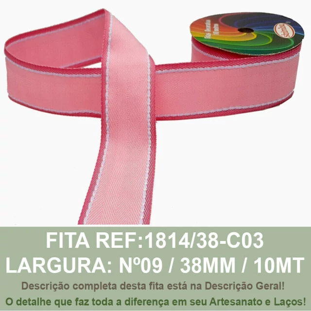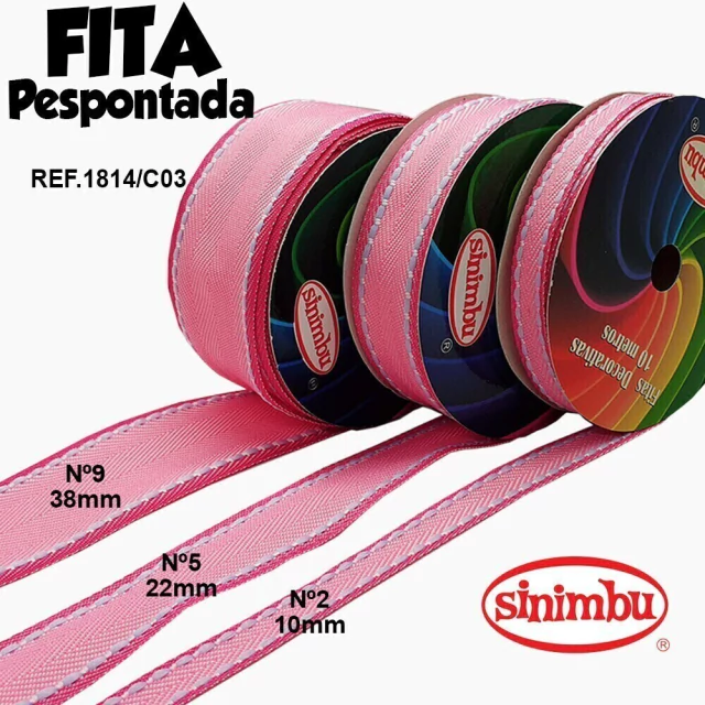 Fita Pespontada 10MT Ref.1814/C03 RS/LI (Larg:10/22/38mm) SINIMBU - Ref: 1814/C03 - Cor: 03 - Pespontada Rosa/Lilas - Modelo: Pespontada - Sem Arame - Larguras Disponíveis: Nº2 - 10mm / Nº5 - 22mm / Nº9 - 38mm - Metragem do Rolo: 10 metros - Venda Unitária por rolo/Largura - Marca: Sinimbu - Obs: Prezado(a) cliente, cada largura tem valor diferente, preste atenção na hora da compra! - Prazo de envio dos pedidos: até 5 dias úteis após pagamento!
