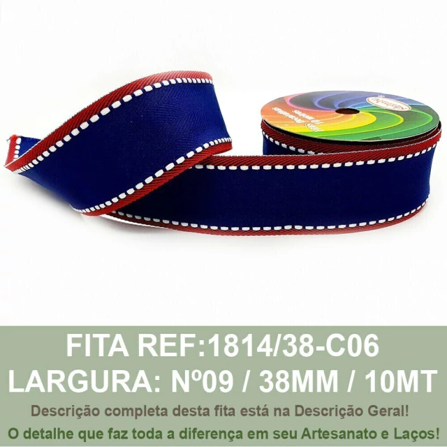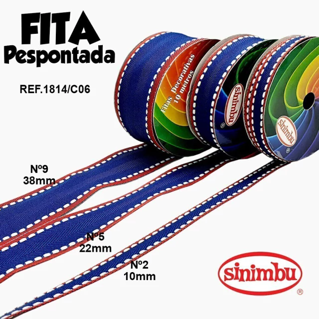 Fita Pespontada 10MT Ref.1814/C06 AZ/VM/BC (Larg:10/22/38mm) SINIMBU - Ref: 1814/C06 - Cor: 06 - Pespontada Azul Esc/Vermelho/Branco - Modelo: Pespontada - Sem Arame - Larguras Disponíveis: Nº5 - 22mm - Metragem do Rolo: 10 metros - Venda Unitária por rolo/Largura - Marca: Sinimbu - Obs: Prezado(a) cliente, cada largura tem valor diferente, preste atenção na hora da compra! - Prazo de envio dos pedidos: até 5 dias úteis após pagamento!