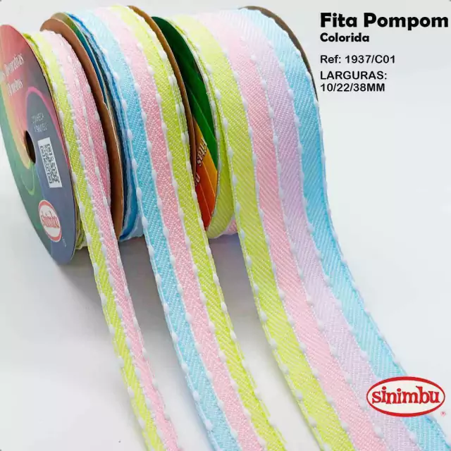 Coleção Fitas com POMPOM da Sinimbu ref.1937 - Larguras 10/22/ 38mm, são realmente uma fita de 1ª linha, você que preza por qualidade e satisfação de seus clientes não pode deixar de comprar essa fita, temos certeza que essa fita fará a diferença na confecção de laços e artesanato em geral!